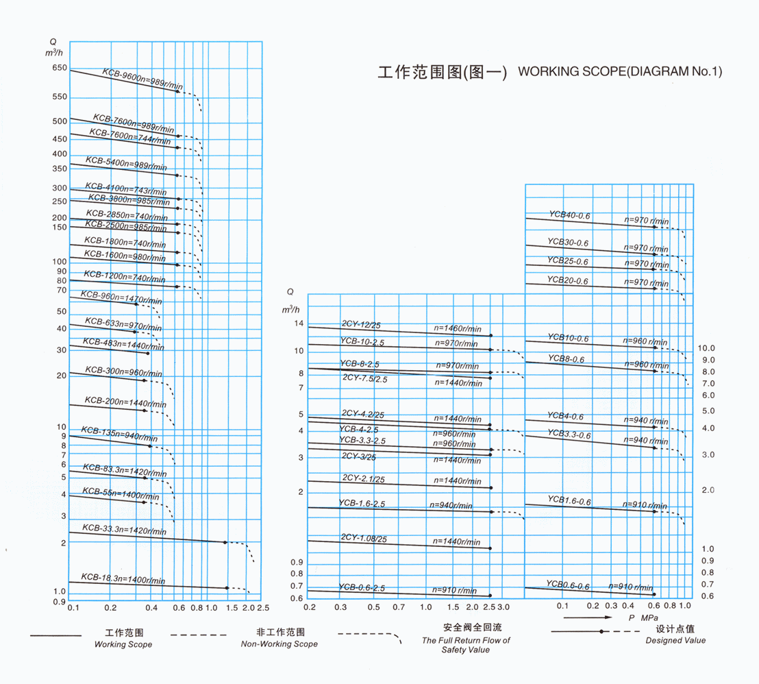 | ? | 各型齒輪泵的性能參數,是在介質粘度4×10-5m2/s(40cSt)時確定的。性能參數表中給出的參數值適用于介質粘度1×10-5~8×10-5m2/s(10~80cSt)范圍內,超出這個范圍則根據用戶提出的性能參數要求另行確定。 各型齒輪泵性能參數中給出的排出壓力是給出的最大工作壓力值,在此范圍內泵均能正常工作,其工作范圍見下圖。 |